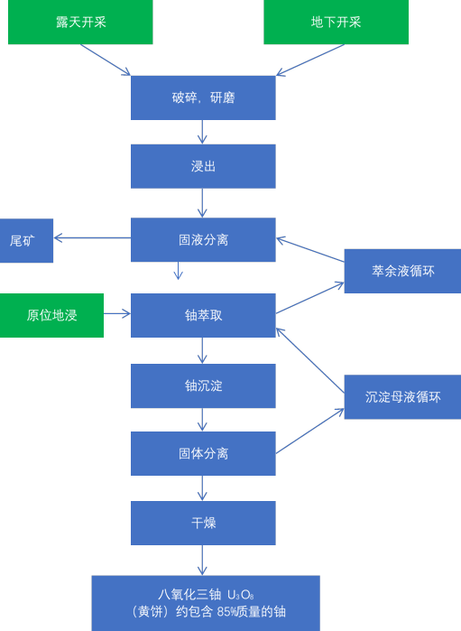 世界主要鈾礦的開采方式包括三種:原位地浸開采,露天開采及地下開采。世界約48%的天然鈾通過原位地浸開采生產出來,46%來自于常規開采方法(露天開采及地下開采)生產出來,6%作為其他礦產品副產品采出。 鈾礦開采生產工藝示意圖 2017年世界各國產鈾比例(總產量為59,531噸鈾) 原位地浸開采 原地浸出采鈾是將溶浸液通過注液鉆孔注入到可滲透的含礦含水層,使溶浸液在滲透過程中與鈾接觸并進行溶解反應,生成含鈾溶液,并從抽液孔被抽至地表,輸送到車間加工處理后獲得鈾產品的流程。 ? 適用賦存于含水及可滲透砂巖中鈾礦物開采。 ? 圈定鈾礦的邊界品位為0.001%。 ? 根據浸出機理的不同,分為酸法和堿法開采。 開采的適用條件: (1)含礦巖性應為具有滲透性的砂巖、砂礫巖。礦體賦存于地下水位以下的含礦含水層中。充水性和滲透性是地浸是否可行的決定性因素。 (2)礦體產狀平緩(傾角一般小于10度),礦體頂底板應是良好封閉的不透水層。 (3)礦床平米鈾量應在最低經濟指標之上,含礦含水層中碳酸鹽含量>2%則不宜用酸法浸出。圍巖以長石石英質或石英質砂巖最宜。 (4)按照目前鈾價,開采礦體最大埋藏深度不宜超過400-600m。 浸出機理 酸法 主要使用硫酸作為溶浸劑,礦石中鈾隨溶浸液pH值的下降2以下后從沉淀態變為溶解態,生成硫酸鈾酰溶液。含礦含水層中碳酸鹽含>2%則不適用。 堿法 主要使用碳酸氫銨作為溶浸劑,礦石中鈾隨溶浸液pH值上升到9以上后礦石中的6價鈾與碳酸鹽中的碳酸根(CO32-)絡合,生成碳酸鈾酰溶液。產品液鈾含量低,銨鹽也造成地下水污染。 二氧化碳+氧氣 原理是氧氣氧化礦石,在地下水中加入二氧化碳后,形成的碳酸氫根(HCO3-)離子與礦層中的鈾發生反應,使鈾溶解在溶液中,也屬于堿法浸出分類。 細菌浸出 主要選用氧化鐵硫桿菌,在浸出鈾的過程中,主要起間接催化作用,能促進黃鐵礦和硫酸亞鐵的氧化,促進6價鈾生成。可降低酸耗。需配合酸法使用,但并非一種獨立的浸出方法。 地浸的主要優點: (1)開采方法安全簡單、工藝流程短。采礦階段無需搬運、破碎礦石,水冶階段無需磨礦和固液分離,縮短了采冶工藝流程,直接生產成本低。 (2)礦山建設周期短、基建投資少,勞動強度低、自動化程度高,固定資產折舊低。 (3)環境污染小。一是抽注基本平衡,地浸溶液是在閉路管道內循環使用,其廢水排放量顯著減少;二是放射性粉塵污染得到徹底改善;三是尾渣和廢氣的污染減到了最低程度。 露天開采即一個移走礦體上的覆蓋物,從敞露地表的采礦場采出鈾礦物的過程。主要適用于主礦體埋藏較淺的鈾礦床開采。 主要優點包括: 1. 基建周期短。2-4年/大型 6-8月/小型。 2、開采空間大,勞動生產率高。比地下開采高2-10倍。 3、礦石損失、貧化率較小。損失率3%-5%貧化率5%-8%。 4、開采成本低,勞動條件好,生產安全。 主要缺點: 1、開采受到氣候影響大。 2、基建設備投資大。 3、礦山占地多,對地表環境破壞大。 地下開采即通過開掘井巷工程從地下礦床的礦塊里采出礦石的過程,通過礦床開拓、礦塊的采準、切割和回采4 個步驟實現。主要適用于埋藏較深及地表不允許露天開采的鈾礦床。以地壓管理方法為依據,分為空場采礦法充填采礦法、崩落采礦法三大類。